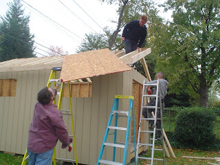 Dad came down to help w/ the shed - good thing b/c there was no way I could lift those heavy OSB boards up a ladder and onto the roof... I encouraged instead!.